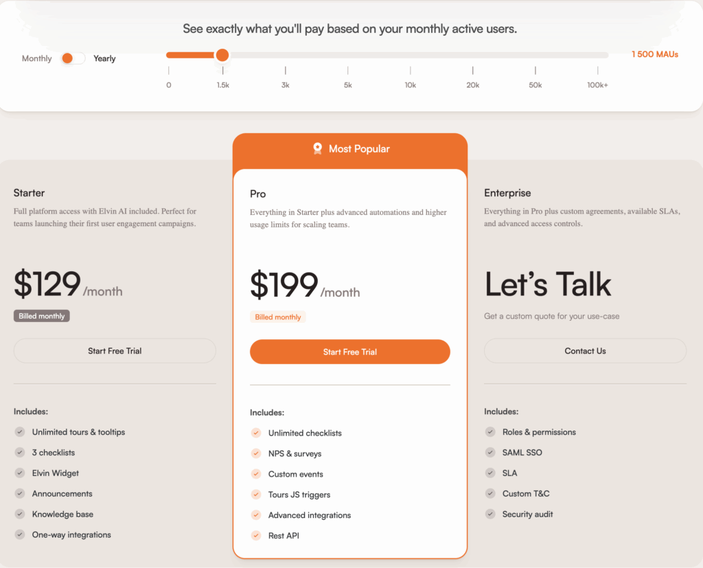 Starting Price (2,000 MAU) | $129/month | $174/month | Product Fruits |
