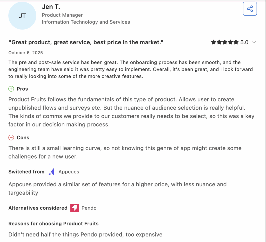 “Appcues is easier to use, but Product Fruits gave us way more value. The AI tour builder is incredible—it generated our first tour in 5 minutes.” — G2 Reviewer, Product Manager