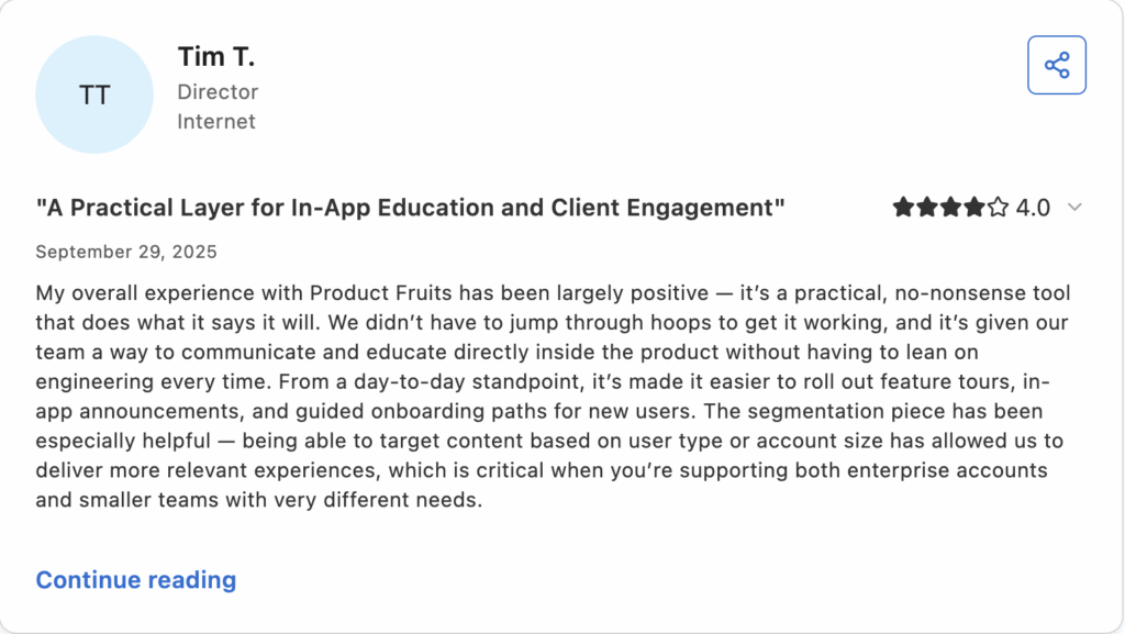 “Userpilot’s behavioral triggers are powerful, but we spent two weeks in setup before going live. Product Fruits was operational in 3 days with comparable results for our use case.” — G2 Reviewer, Product Lead