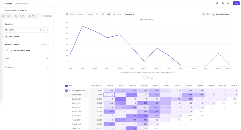 User retention rate is the percentage of new sign-ups who remain your users after a period of time, for example, a month.