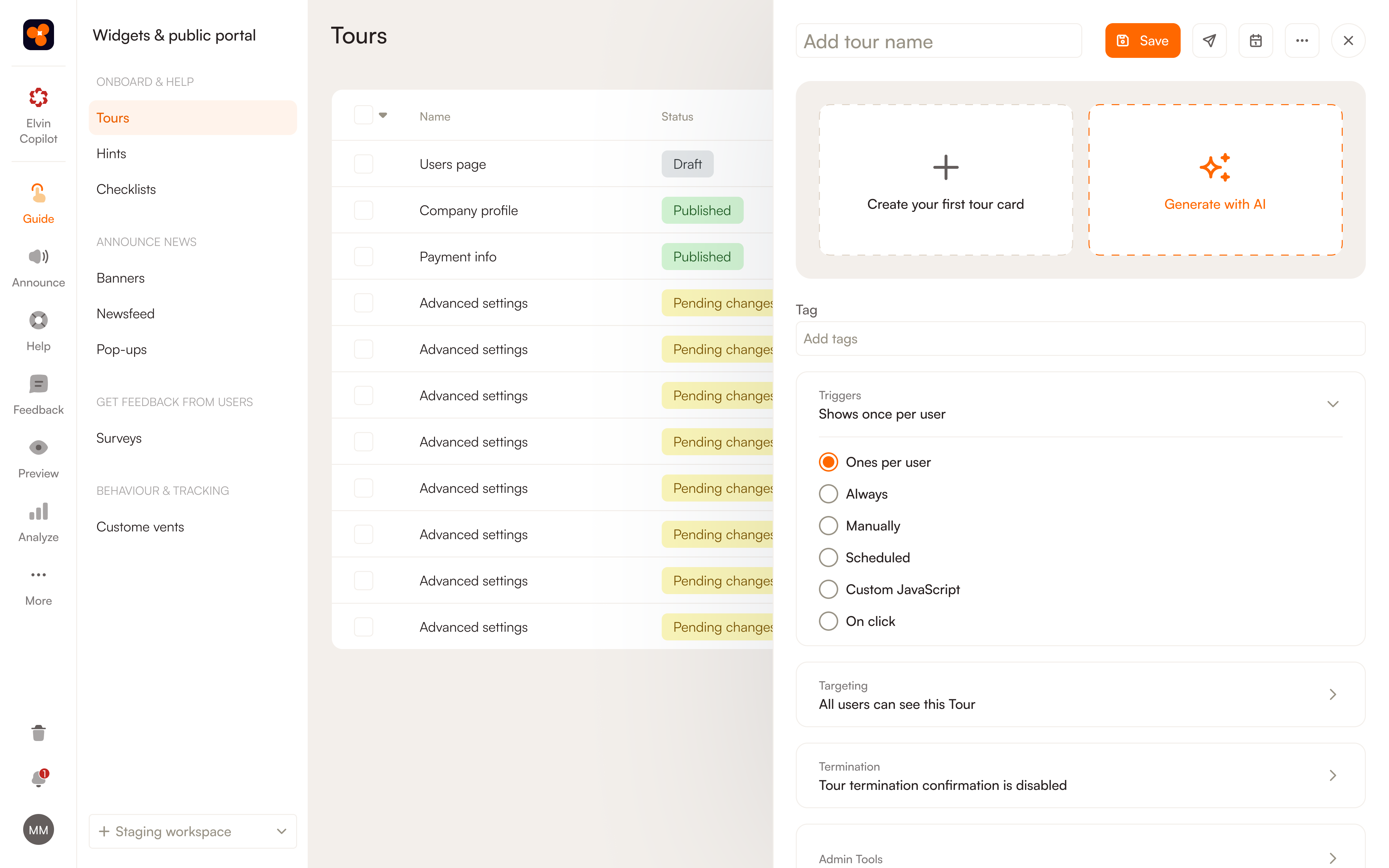 Click “Generate with AI” within any tour, tooltip, announcement, or checklist builder